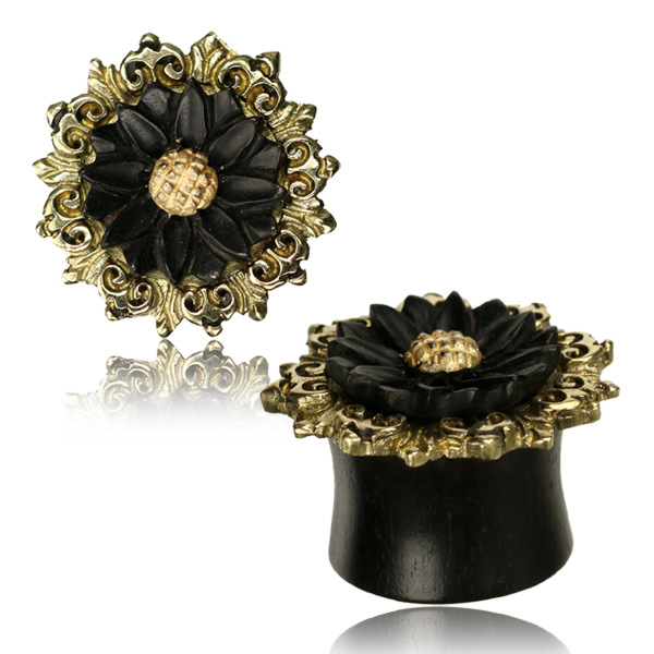 Плаги ручной работы в форме цветка из тёмного падука в латунной окантовке.