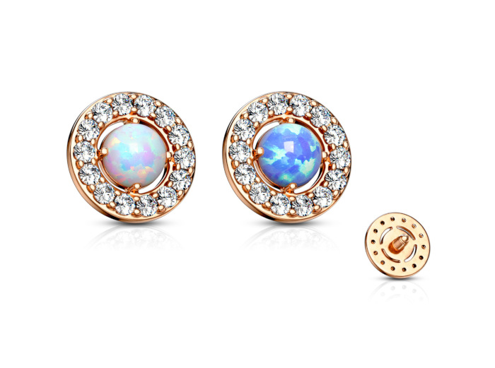 Наркутка диаметром 6,5мм из хирургической стали 316L и латуни с IP покрытием розового золота. Украшена искусственным опалом в окружении 14ти фианитов. Резьба накруток 1,2мм подходят к микродермалам и украшениям толщиной 1,6мм с внутренней резьбой.