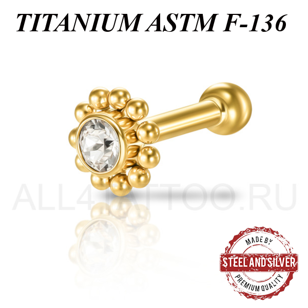 Микроштанга из имплантационного титана 6Al-4V-Eli ASTM: F-136 с 24х каратным золотым PVD покрытием, внутренняя резьба. Украшен Premium Crystals диаметром 3мм.