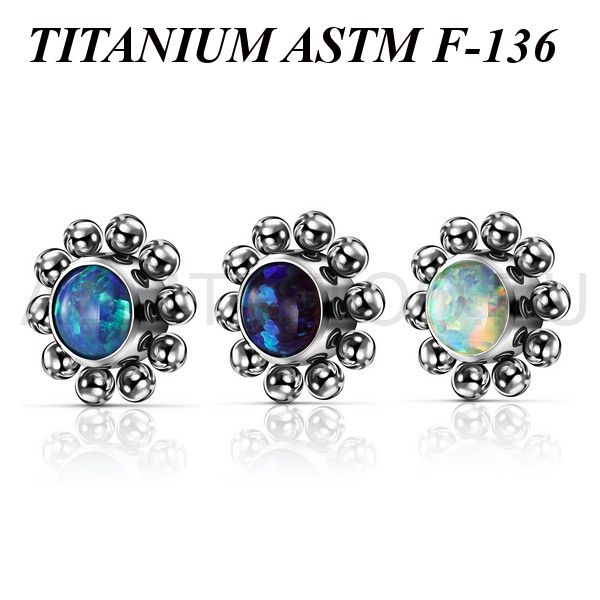 Накрутка из имплантационного титана 6Al-4V-Eli ASTM: F-136. Украшена лабораторным опалом. Подходит для украшений с внутренней резьбой толщиной 1 и 1,2 мм.
