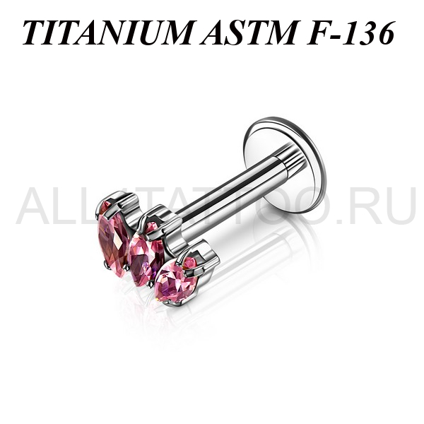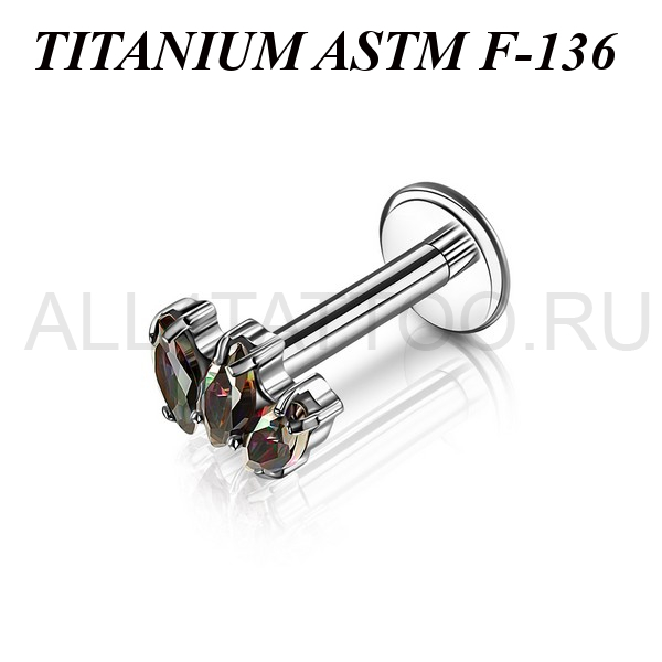 Лабрет с внутренней резьбой из имплантационного титана 6Al-4V-Eli ASTM: F-136. Украшен накруткой с тремя фианитами огранки "маркиз".