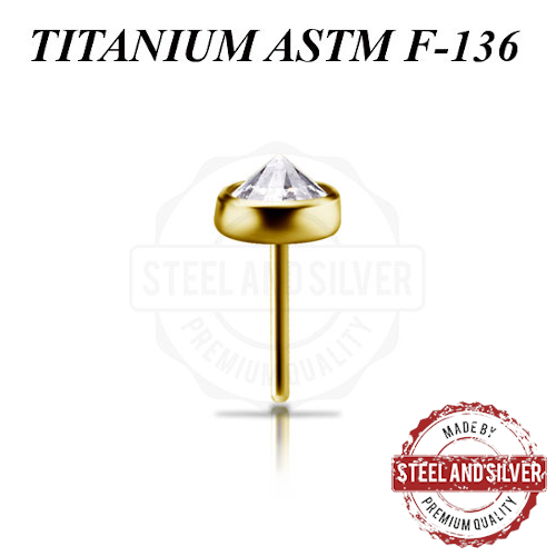 Вставка для безрезьбовых украшений из имплантационного титана 6Al-4V-Eli ASTM: F-136 с 24х каратным золотым PVD покрытием. Украшена прозрачным кристаллом Premium Cubic Zirconia.