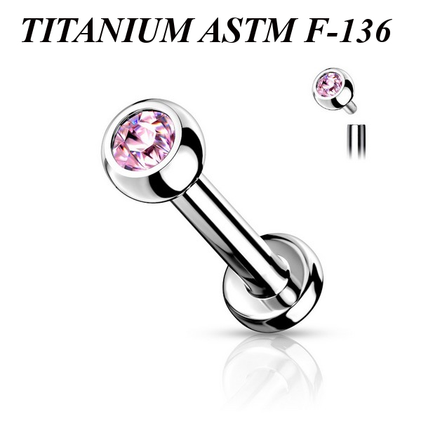 Лабрет из имплантационного титана 6Al-4V-Eli ASTM: F-136 с внутренней резьбой и цветным фианитом.