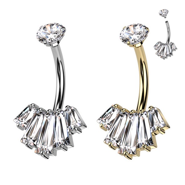 Банан с внутренней резьбой из хирургической стали 316L с декоративной частью из родированной латуни, украшенной прозрачными кристаллами. Представлен в классическом стальном варианте и с золотым PVD покрытием. Размер декоративной части: 13х9мм.