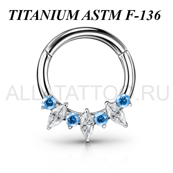 Кликер из имплантационного титана 6Al-4V-Eli ASTM: F-136. Предаствлен в двух вариантах: полностью прозрачные фианиты и чередующиеся синие с прозрачными фианиты.