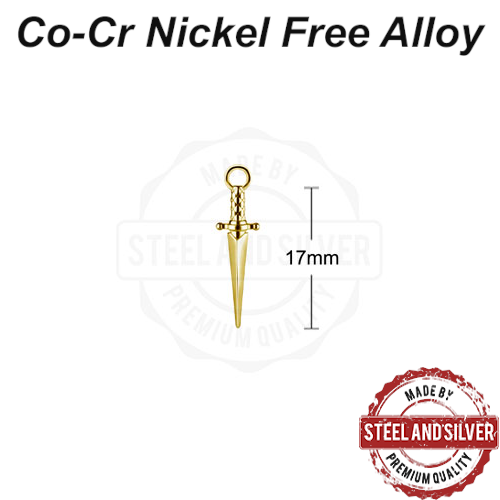 Подвеска из сплава кобальт-хрома, без содержания никеля. Представлена в двух вариантах: классического стального цвета и с 24х каратным золотым PVD покрытием. Подходит для колец толщиной не более 1,6мм.