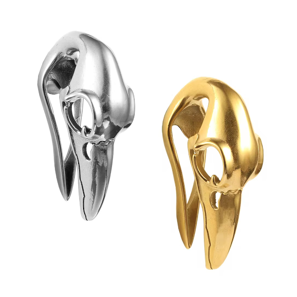 Фигурные подвесы из латуни в форме черепа птицы. Представлены в двух вариантах: родированные и с золотым PVD покрытием.