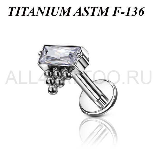 Лабрет с внутренней резьбой из имплантационного титана 6Al-4V-Eli ASTM: F-136. Украшен кластером с прозрачным фианитом.  Размер декоративной части: 5х5мм.