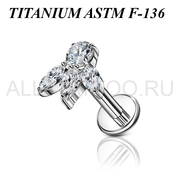 Лабрет с внутренней резьбой из имплантационного титана 6Al-4V-Eli ASTM: F-136. Украшен кластером с прозрачными фианитами.  Размер декоративной части: 6х6мм.
