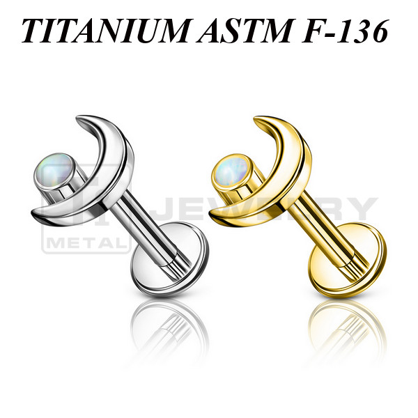 Лабрет из имплантационного титана 6Al-4V-Eli ASTM: F-136. Представлен в двух вариантах: классический титановый и с золотым PVD покрытием. Украшен накруткой в форме полумесяца с синтетическим опалом. Размер накрутки: 6х4мм.