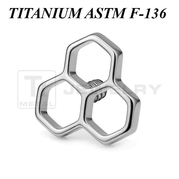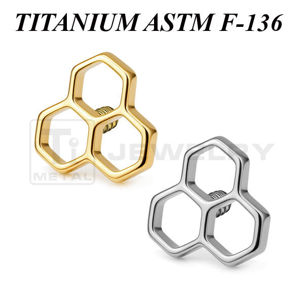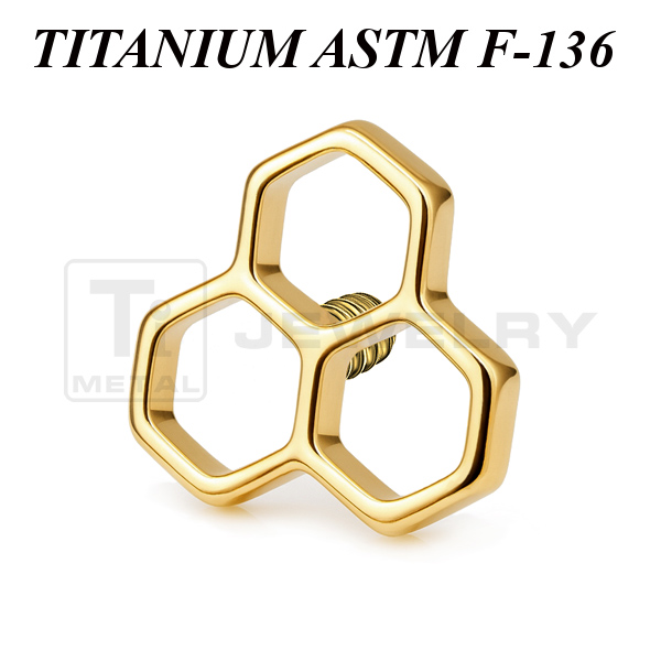 Накрутка из имплантационного титана 6Al-4V-Eli ASTM: F-136 в форме пчелиных сот диаметром 5мм. Представлена в двух вариантах: классическая титановая и с золотым PVD покрытием Подходит для украшений с внутренней резьбой толщиной 1 и 1,2 мм.