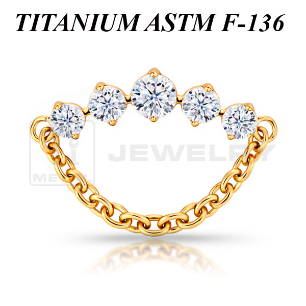 Кластер из имплантационного титана 6Al-4V-Eli ASTM: F-136. Представлен в двух вариантах: классический титановый и с золотым PVD покрытием. Украшен прозрачными фианитами. Размер кластера с учётом цепочки: 11,8х15,7мм. Подходит для украшений с внутренней резьбой толщиной 1 и 1,2 мм.